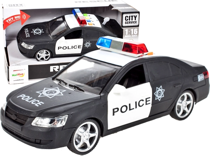 Realistische politiewagen op schaal 1:16 die zowel kleine als grote fans van actievoertuigen zal verrassen. Biedt claxongeluid, sirenes, sluitgeluid van de auto en achteruitrijgeluid voor een authentiek speelgevoel. Compacte afmetingen en eenvoudige bediening maken dit model tot een geweldig cadeau voor kinderen.