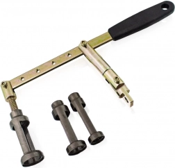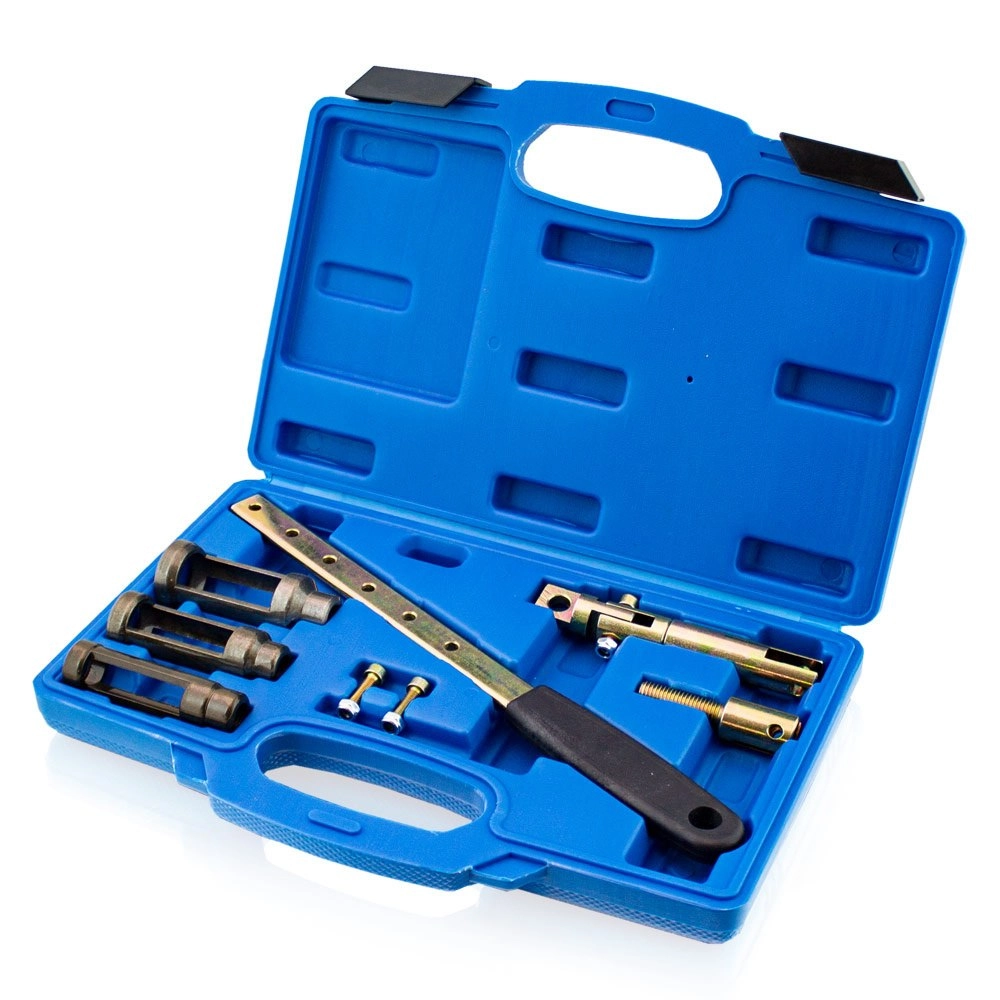 Dankzij de robuuste constructie en de verstelbare arm biedt het gereedschap stabiliteit, precisie en een lange levensduur. De drie meegeleverde uiteinden van 20 mm, 26 mm en 35 mm dekken een breed scala aan klepveren. De complete set zit in een slijtvaste koffer voor eenvoudig transport en overzichtelijke opslag.