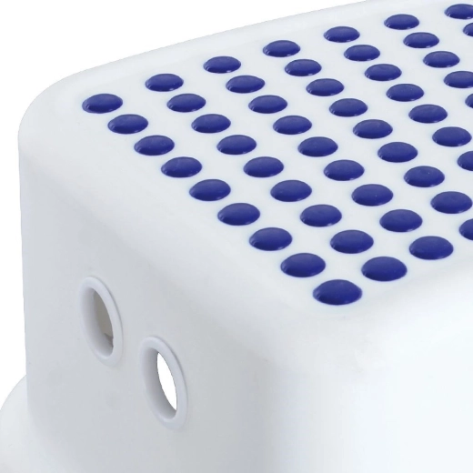 Praktisch en antislip opstapje voor kinderen en volwassenen, maakt het dagelijks bereiken van de wastafel, planken of douche eenvoudiger. Biedt een stabiele constructie, compacte afmetingen van 26 × 36 × 13 cm en een draagvermogen tot 80 kg. Gemaakt van kwaliteitskunststof in wit met blauwe accenten en antisliprubber op het bovenoppervlak en de onderranden.