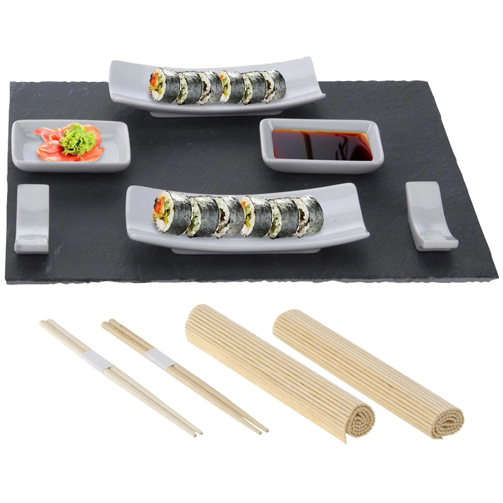 Dankzij de doordachte samenstelling zet je moeiteloos een diner voor twee op tafel: comfortabele eetstokjes met ruststeuntjes, sausbakjes, compacte rolmatjes en een stenen plank voor het serveren van sushi en sashimi. Ideaal voor dagelijks gebruik, feestjes en Japanse avonden.