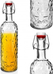 Elegante glazen fles in retrostijl met een inhoud van 1,1 l, voorzien van een beugelsluiting en siliconen afdichting voor een perfecte lekdichtheid. Ideaal als karaf voor limonade, wijn of huisgemaakte siropen. Het kwalitatieve dikke glas met decoratief reliëf accentueert de inhoud en siert de tafel.