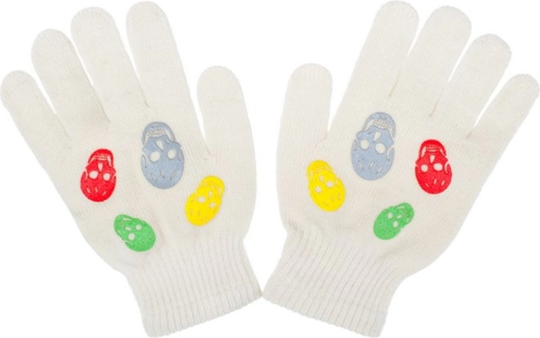 Warme en zachte handschoenen voor kinderen in de moderne kleur cappuccino, ideaal voor winter en herfst. De gebreide structuur zorgt voor draagcomfort, terwijl de elastische boord de handschoenen betrouwbaar op hun plek houdt. Vrolijke, kleurrijke schedels geven een originele look waar kinderen van houden.