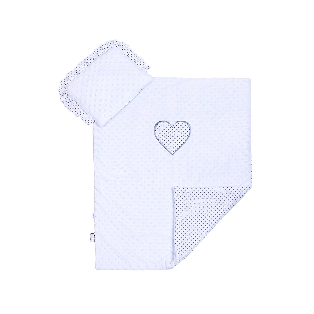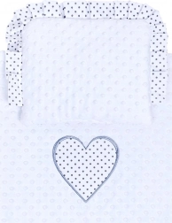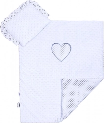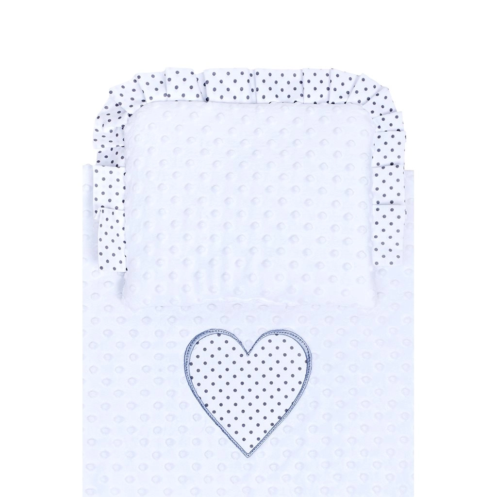 De elegante witte set kinderwagendekens van minky en katoen is ontworpen voor de gevoelige babyhuid. Het zachte minky-oppervlak met reliëfstipjes is warm en aaibaar, de katoenen zijde met all-over stippenprint is prettig en ademend. Het dekentje is versierd met een groot gestipt hartje, het kussentje heeft een lieve ruche – prachtig voor elke kinderwagen en wieg.