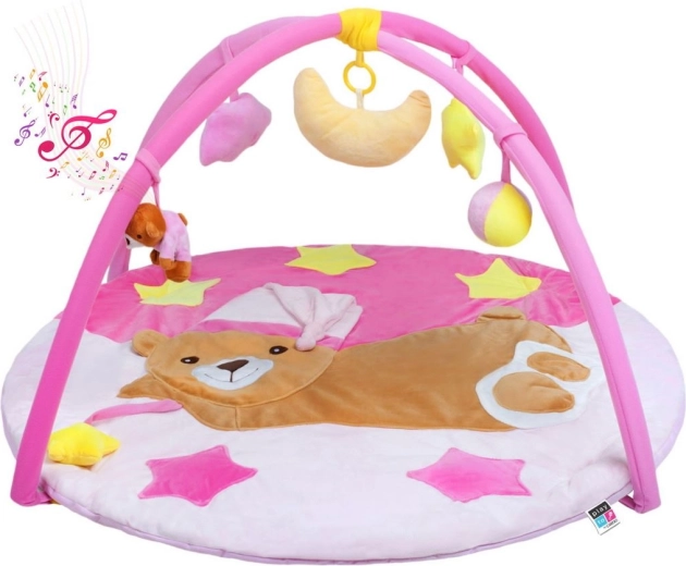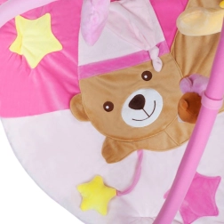 Deze originele educatieve speelmat in het roze met een schattig beertje is ontworpen om de ontwikkeling van zicht, tast en gehoor te ondersteunen. In het maantje zit een geluidsmodule die bij indrukken aangename melodieën afspeelt, terwijl knisperende en bewegende delen de nieuwsgierigheid van het kind prikkelen. De zachte vulling zorgt voor maximaal comfort en een veilige ruimte voor de eerste ontdekkingen.