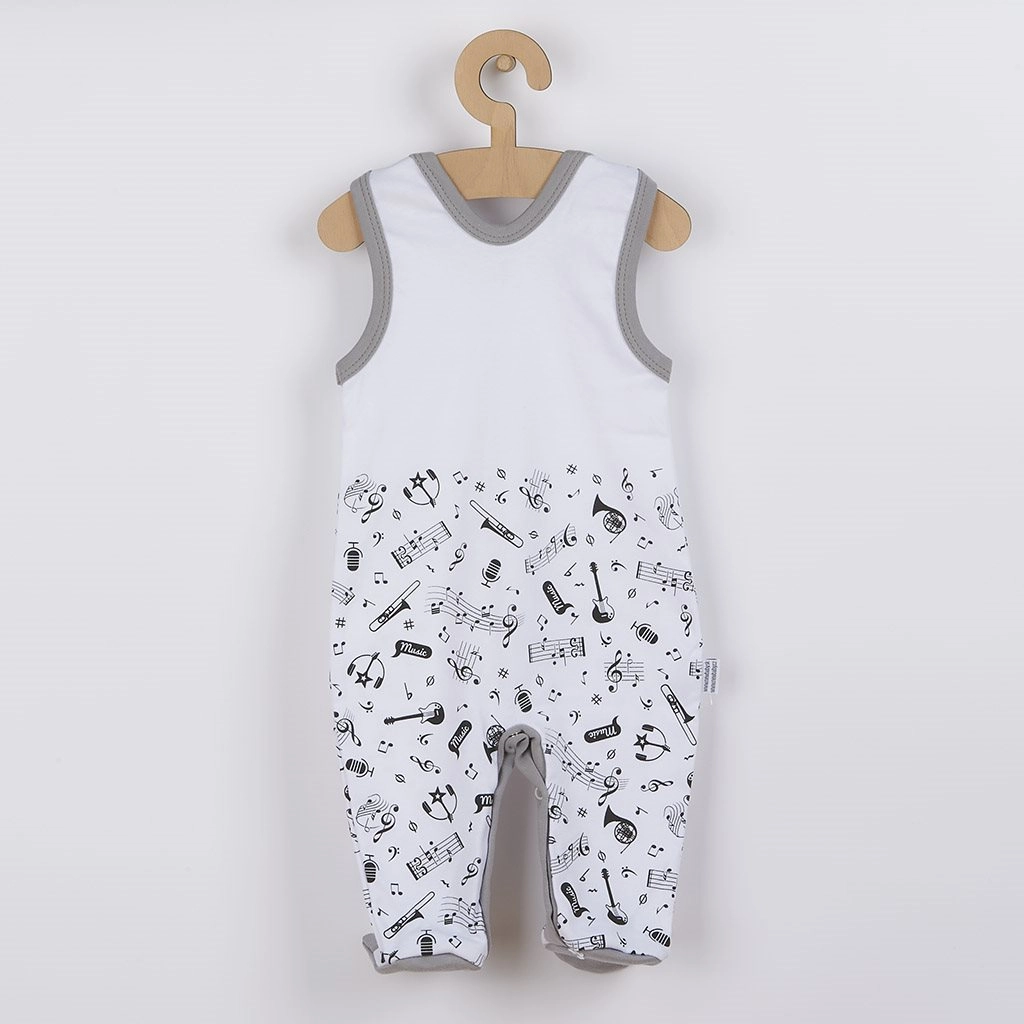 Schattige baby-voetenzak van 100% katoen met motief van muzieknootjes en muziekinstrumenten, leuk voor zowel jongens als meisjes. Praktische drukknoopsluiting op de schouderbandjes en tussen de beentjes maakt aankleden en verschonen eenvoudig. De zachte stof is ademend, huidvriendelijk en ideaal voor comfort de hele dag door.