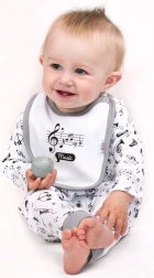 Comfortabele baby half-slofjes van 100% katoen met een vrolijk motief van noten en muziekinstrumenten. Ze hebben een brede, niet-knellende boord voor het gevoelige buikje, zijn zacht voor de babyhuid en dankzij de praktische drukknoopsluiting tussen de beentjes zijn ze eenvoudig te verschonen. Universeel design voor meisjes en jongens.