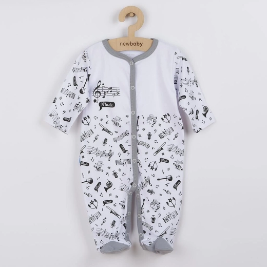Comfortabele en schattige babypyjama New Baby Music van zachte 100% katoen, aangenaam voor de huid met een speelse muziekprint. Praktische drukknoopsluiting over de hele lengte, inclusief tussen de beentjes, maakt omkleden en verschonen eenvoudig. Het universele design is geschikt voor jongens en meisjes en biedt je baby de hele dag comfort.