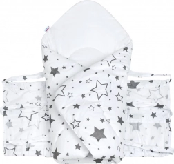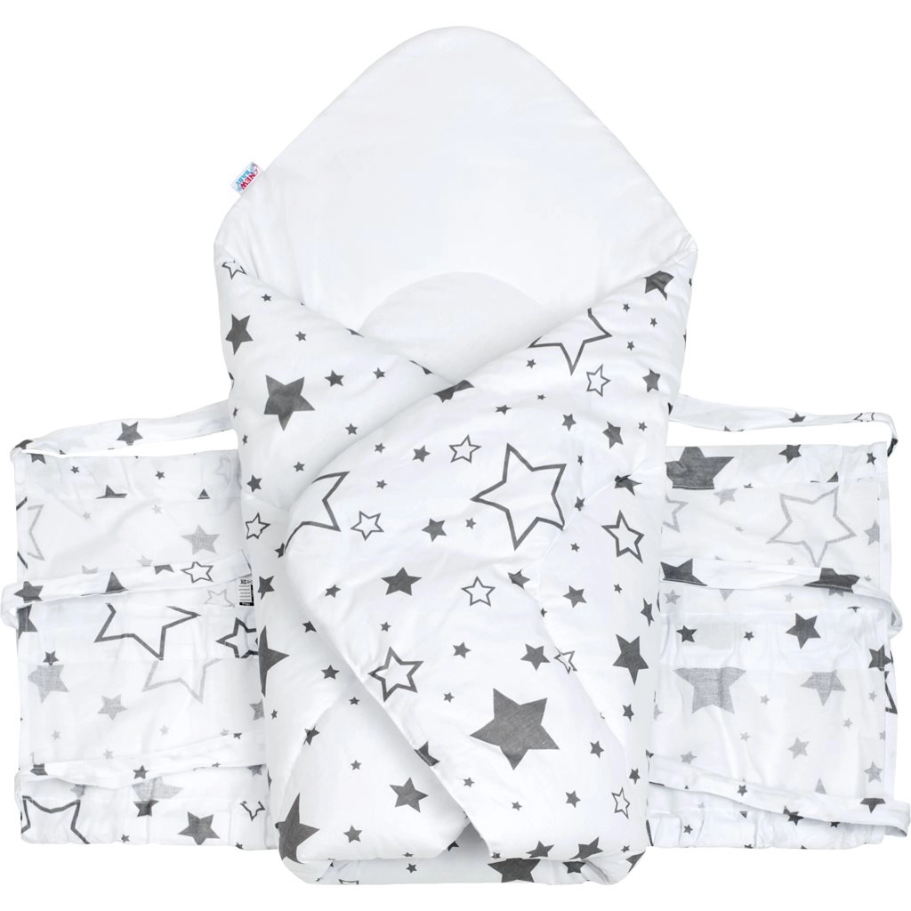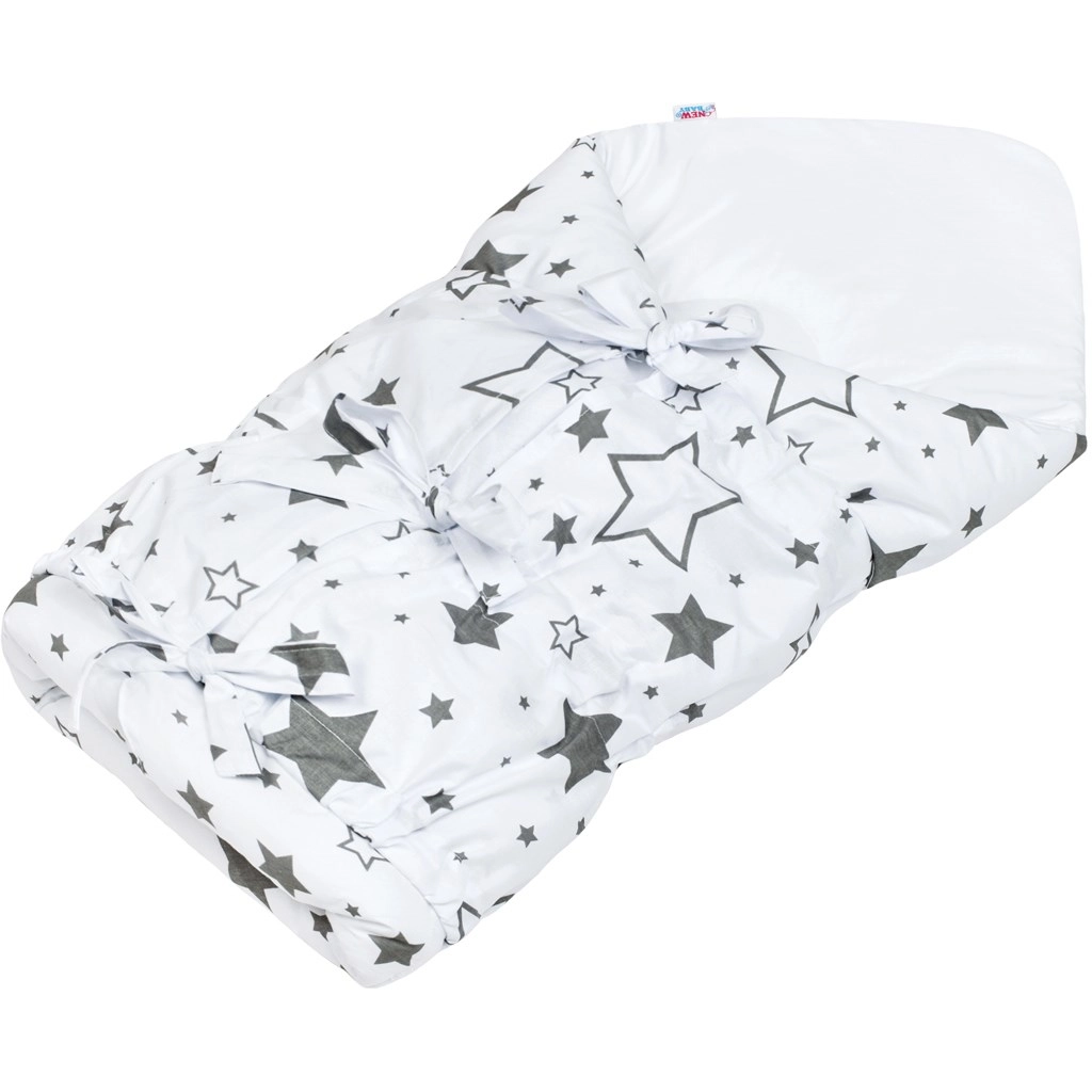 Zachte en veilige wikkeldoek voor pasgeborenen van natuurlijke katoen met een anti-allergische vulling. Biedt warmte, comfort en zekere inbakerking dankzij drie rijen linten. Ideaal voor slapen, borstvoeding en voor in de kinderwagen. Het subtiele patroon van grijze sterretjes werkt rustgevend.