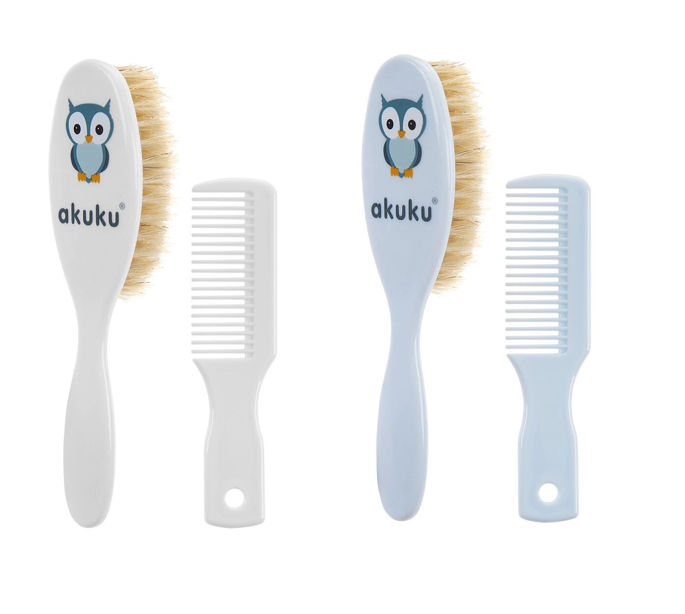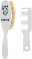 Zachte set voor dagelijkse verzorging van kinderhaartjes: borstel met natuurlijke haren en kam met een uilenmotief. Zacht voor de gevoelige hoofdhuid, BPA-vrij, geschikt vanaf de geboorte.