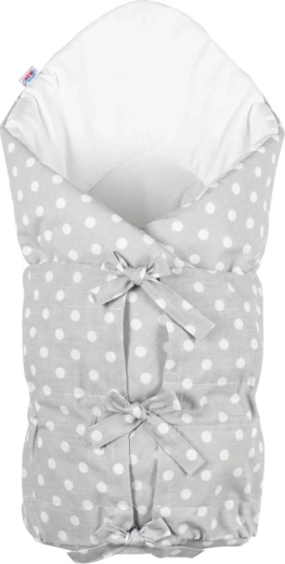 Comfortabele en veilige wikkeldeken voor pasgeborenen van het merk New Baby in een universele grijze kleur met stippen. Biedt de baby een gevoel van geborgenheid en een rustige slaap, ideaal voor thuis en voor in de kinderwagen. Dankzij drie rijen linten wikkelt hij de baby stevig en zacht in. Gemaakt van 100% katoen met een anti-allergische vulling voor maximaal comfort en veiligheid.