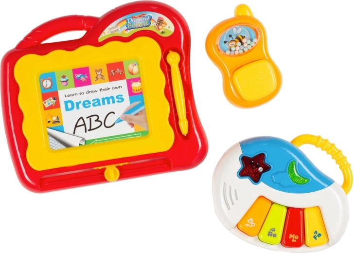 - mini piano met geluiden en melodieën, lichteffecten, afneembare telefoon, omklapbaar boekje, spiegeltje, uitwisbaar tekentablet, zij-speeltjes