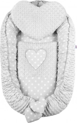 Het NEW BABY Minky hartje-nestje in grijs is een praktische helper voor de eerste levensmaanden. Dankzij het dubbelzijdige design wissel je naar wens – aan de ene kant zachte Minky met nopjes voor sensorimotorische stimulatie, aan de andere kant ademend 100% katoen. Door het koord aan te trekken pas je de binnenruimte eenvoudig aan en creëer je een knus en beschermd plekje voor je baby.