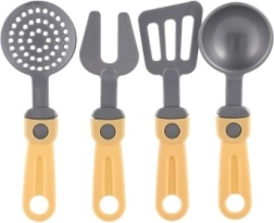 De set bevat drie potten met deksels en vier verschillende keukengereedschappen, ideaal voor verschillende soorten denkbeeldige kookactiviteiten.