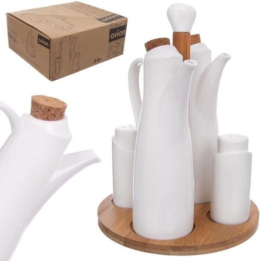 Deze 5-delige porseleinen set is ideaal voor dagelijks dineren en feestelijk serveren. Hij combineert een strak wit design met natuurlijk bamboe en brengt orde en stijl in je keuken. Dankzij de kurken stoppen blijven je oliën en azijnen langer vers en het porselein kan zonder zorgen in de vaatwasser.