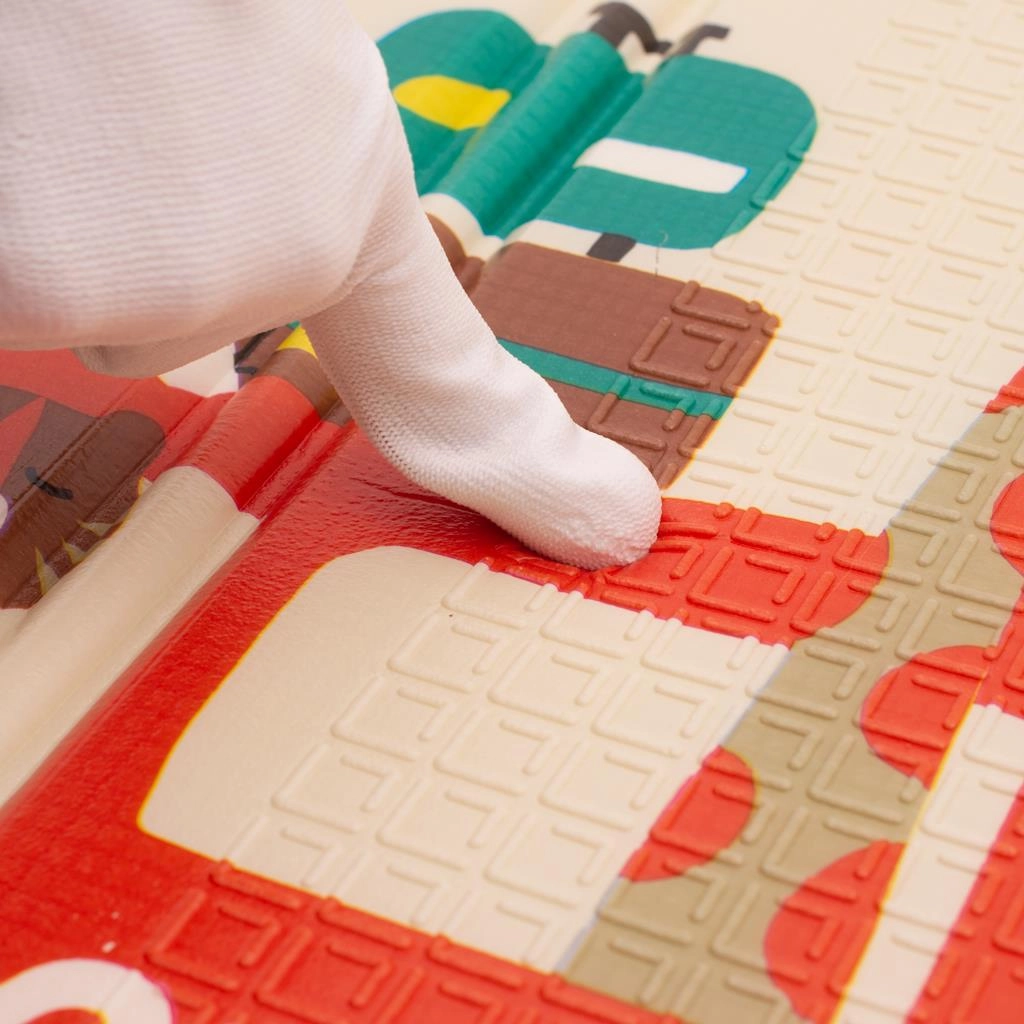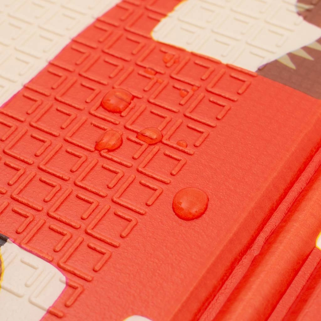 Het XPE-materiaal en de gelamineerde folie zorgen voor vochtbestendigheid, eenvoudig onderhoud en comfortabele aanraking. De mat isoleert uitstekend tegen koude vloeren, beschermt tegen mijten uit tapijten en dempt geluid. Hij is gecertificeerd volgens EN71, bevat geen ftalaten en voldoet aan strenge eisen op het gebied van veiligheid en chemische samenstelling.