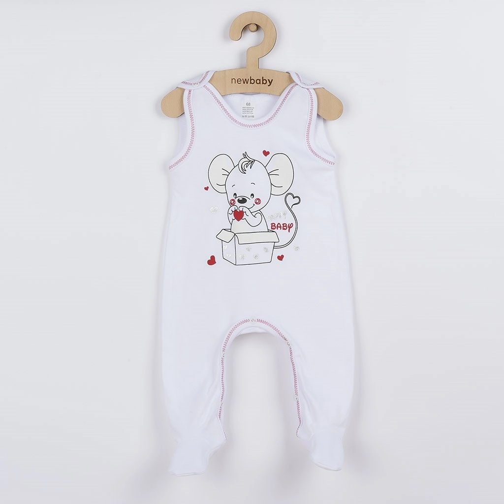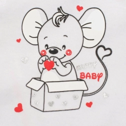Schattige babyset New Baby Mouse in het wit biedt comfort en functionaliteit voor dagelijks gebruik. De set bestaat uit slaapoverall met voetjes en jasje van 100% katoen, dat zacht is voor de babyhuid. Praktische drukknoopsluiting over de volledige lengte van het jasje en op de schouder en tussen de beentjes van de slaapoverall maakt aankleden en verschonen makkelijker. De slaapoverall is versierd met een grote muizenprint en kleurrijke biezen. Tsjechisch merk.