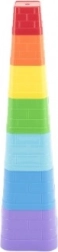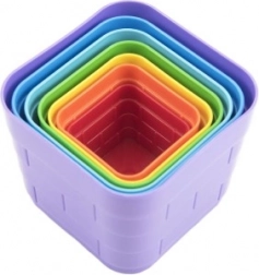 Zeven vierkante blokken in levendige kleuren zijn eenvoudig te stapelen tot een stabiele toren en stimuleren coördinatie en geduld.