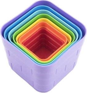 Het duurzame kunststof zonder scherpe randen is geschikt voor spelen binnen en buiten – je kunt de blokken meenemen naar het zand of in het water. De onderdelen nestelen eenvoudig in elkaar, waardoor de set weinig ruimte inneemt en gemakkelijk op te bergen is.