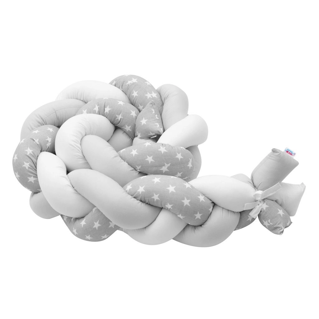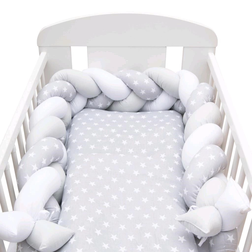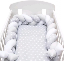 Stijlvolle en veilige gebreide bedomrander van NEW BABY beschermt de baby tegen stoten tegen de spijlen en zorgt voor een knusse, rustige slaapomgeving. Dankzij de zachte vulling en hoogwaardige 100% katoen is hij aangenaam aan te raken, flexibel en past hij zich gemakkelijk aan elke wieg of ledikant aan. Het neutrale grijs‑witte design met sterretjes past in elke kinderkamer.