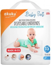 Praktische wegwerponderleggers AKUKU Baby Soft beschermen matrassen, verschoonkussens en bedden betrouwbaar tegen vocht en vervuiling. Dankzij de zachte bovenlaag van cellulose zijn ze aangenaam voor de babyhuid, terwijl de ondoordringbare folie aan de onderkant doorlekken voorkomt. De verpakking bevat 15 stuks met een afmeting van 40 × 60 cm en een 8-laagse constructie voor maximale bescherming.