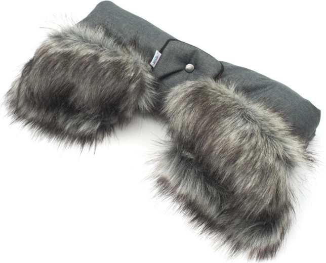 Praktische 2-in-1 handwarmers voor de kinderwagen met zachte bontrand in een elegante grafietkleur houden je handen warm en comfortabel, zelfs bij vrieskou. Beschermt tegen kou, wind en motregen, eenvoudig te bevestigen met drukknoopjes en elke hand heeft zijn eigen handschoen voor maximaal comfort.