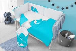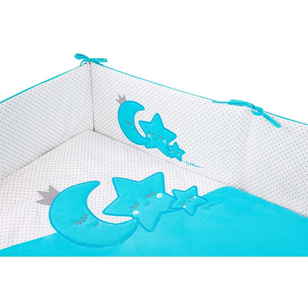 De zachte BELISIMA Magic Stars babybedset in turkooiskleur biedt comfort, veiligheid en een rustige slaap voor je kleintje. Bevat beddengoed 40 × 60 en 100 × 135 cm, een bedbumper, vullingen voor kussen en dekbed en een hemel. Gemaakt van 100% katoen met een hypoallergene vulling, veilige ritsen zonder los bungelende runners, zonder knopen en harde onderdelen.