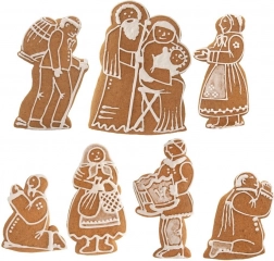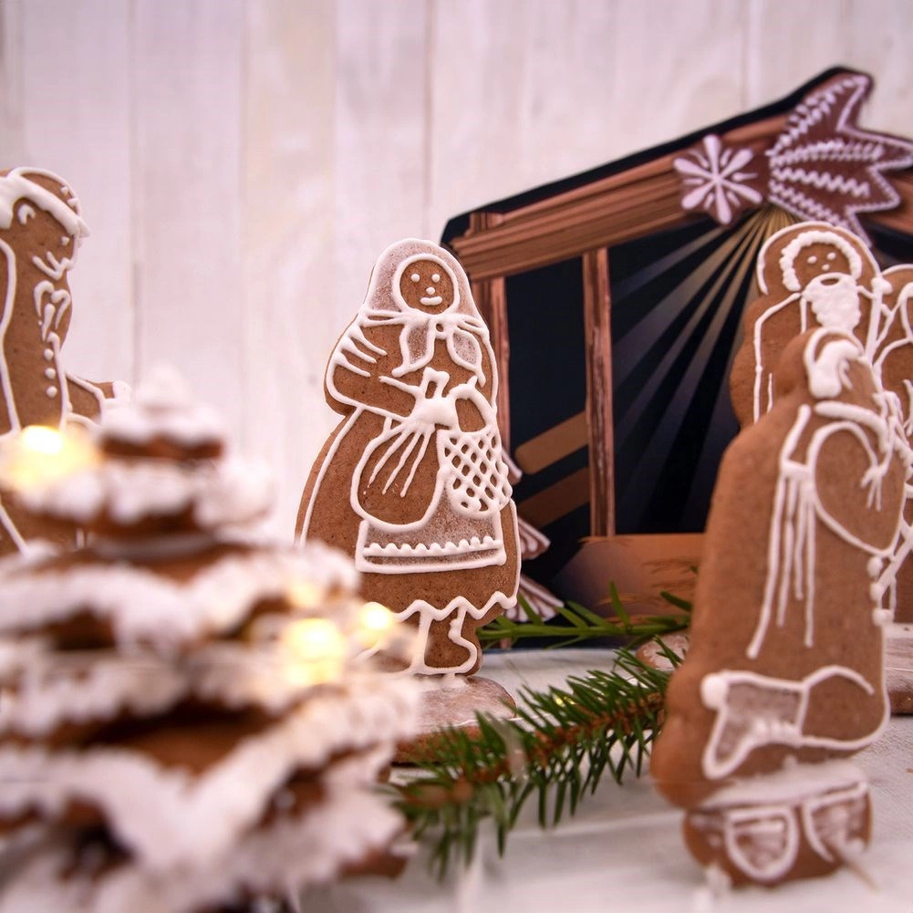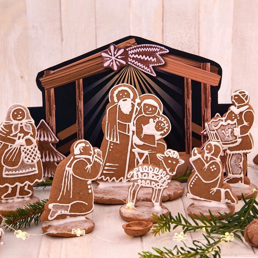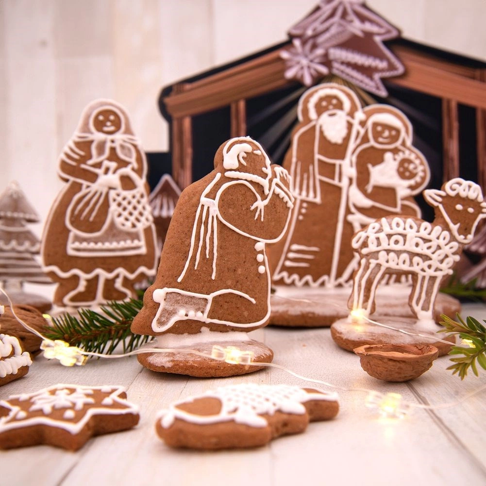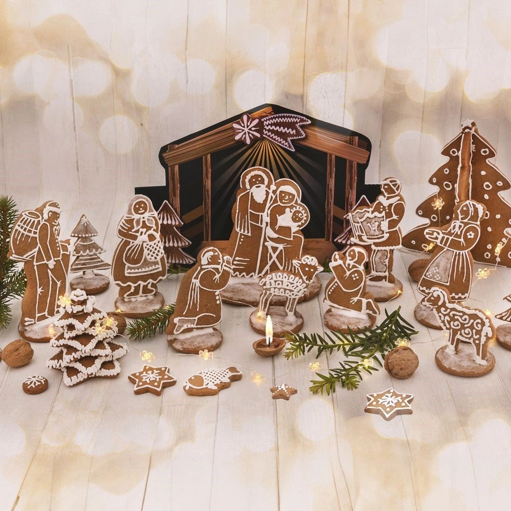 Met de set kerstuitstekers snijd je eenvoudig nauwkeurige vormen van figuurtjes en dieren uit de kerststal en creëer je een originele kerstdecoratie én heerlijk gebak. De breedte van de afzonderlijke vormpjes is ca. 2–9 cm en de lengte 7–12 cm – ideaal voor peperkoek en koekjesdeeg. De gekleurde kartonnen achtergrond helpt om de hele scène af te stylen.