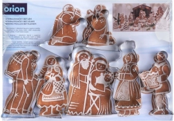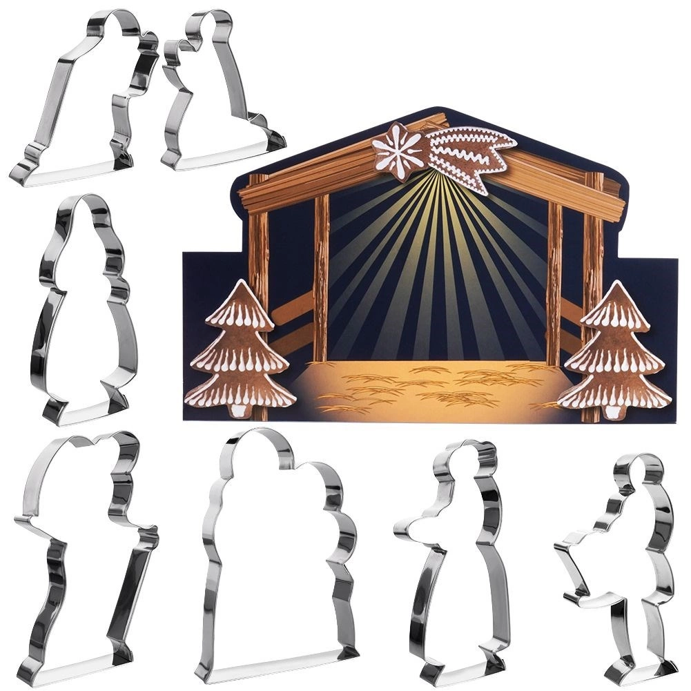 Maak thuis je eigen kerststal van geurige peperkoek of koekjes met de set van 7 hoogwaardige roestvrijstalen uitsteekvormpjes met motieven uit de kerststalscène. De vormpjes hebben preciese vormen van figuren en dieren, inclusief een gekleurde achtergrond van karton voor een opvallende presentatie. Duurzaam roestvrij staal zorgt voor een lange levensduur en eenvoudig reinigen in de vaatwasser.