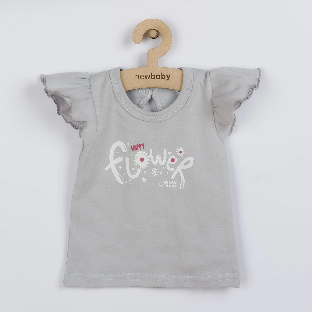 Schattige tweedelige babyset New Baby Happy Flower in het grijs, die comfort en stijl voor elke dag combineert. Bevat een T‑shirt met geruffelde mouwtjes en praktische drukknoopsluiting in de nek aan de achterkant, en een broekje met een bredere tailleboord. All-over bloemetjesprint en de tekst Happy Flower zorgen voor een speelse look, terwijl 100% katoen zachtheid, ademend vermogen en comfort biedt voor de gevoelige babyhuid.