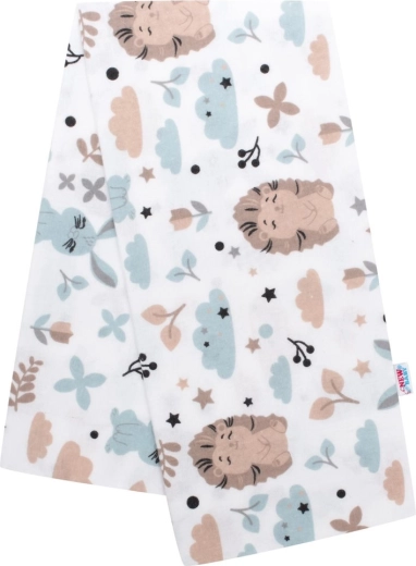 De flanellen luier NEW BABY met witte basis en een print van een egel en een haasje biedt je baby zachtheid en comfort. Dankzij 100% katoen met fijne flanel is hij aangenaam aanvoelend, neemt uitstekend vocht op en droogt snel. De hoogwaardige afwerking garandeert een lange levensduur, zelfs bij veelvuldig wassen.