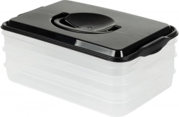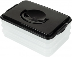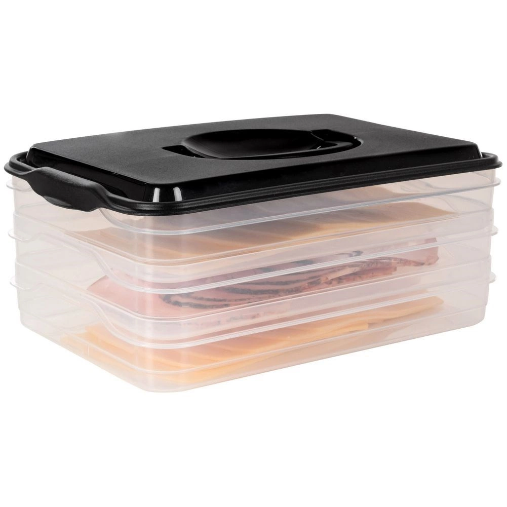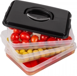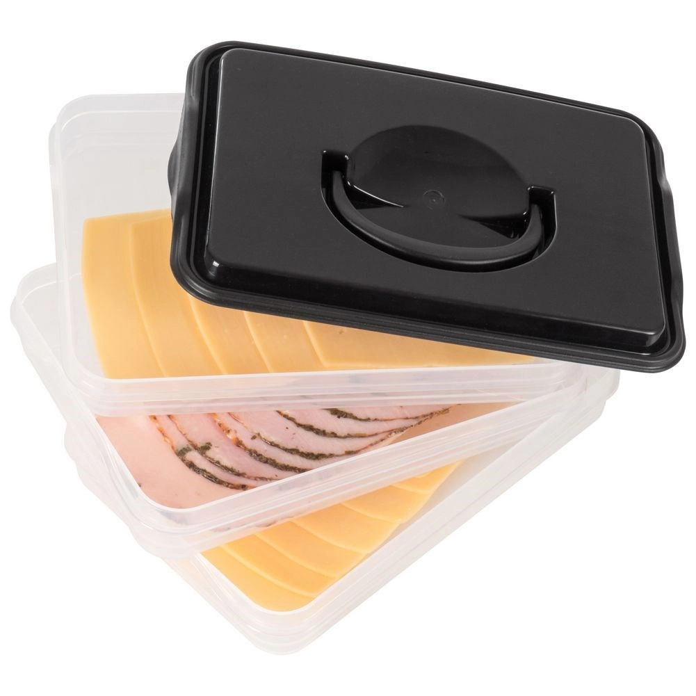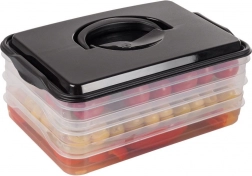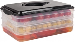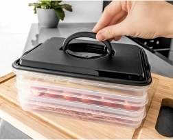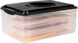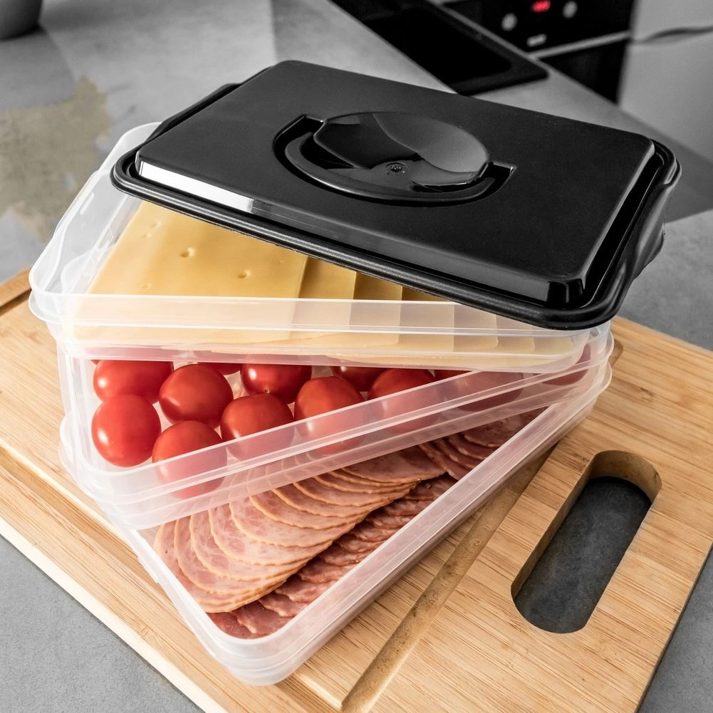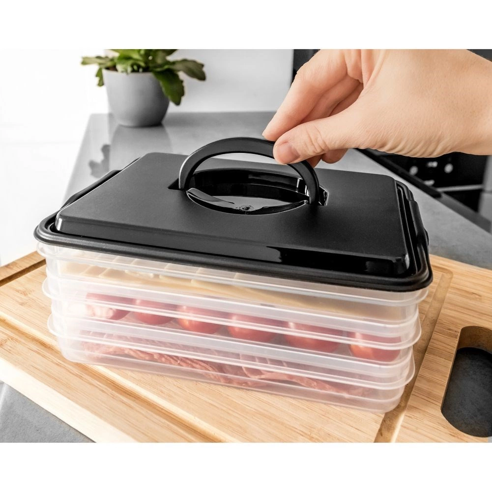 Deze slimme voedselorganizer biedt drie uitneembare, transparante lagen voor het handig bewaren van plakjes kaas, vleeswaren en kleine ingrediënten zonder geurmenging. De compacte rechthoekige vorm past perfect op koelschappen en de robuuste zwarte kap met handgreep zorgt voor eenvoudige handling.