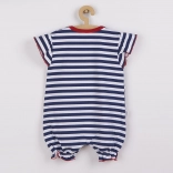 Schattige meisjes jumpshort NEW BABY Marine van zachte 100% katoen, ideaal voor de zomer. Heeft korte mouwtjes met ruffles, een modern gestreept design en een ankerpats met voering tegen krassen. Dankzij de praktische drukknoopsluiting op de schouder en tussen de beentjes is aankleden en verschonen heel eenvoudig.