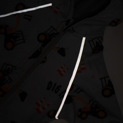 Doordachte details zoals een rits over de volledige lengte met stofachterkant tegen tocht, een capuchon en bredere elastische boorden aan mouwen en pijpen verhogen het comfort. Het materiaal is glad, elastisch en zacht aan de touch, en tegelijkertijd vuilafstotend en neemt geen water op. Reflecterende paspels op de mouwen verbeteren de zichtbaarheid bij weinig licht.