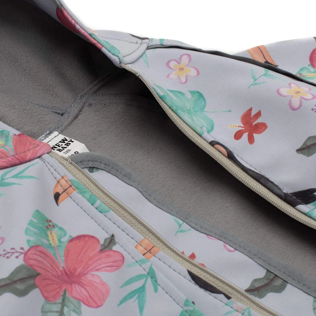 Stijlvolle en functionele softshell overall voor baby’s van het merk New Baby met toekanmotief. Biedt waterdichtheid, winddichtheid en ademend vermogen voor comfortabel dagelijks gebruik. De praktische rits over de volledige lengte maakt aankleden gemakkelijk, de gevoerde binnenkant van kortgeschoren fleece houdt warmte vast en elastische boorden zorgen voor een perfecte pasvorm. Reflecterende elementen op de mouwen verhogen de veiligheid bij schemering.