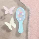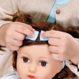 De pop heeft bruin haar dat je kunt kammen met de blauwe borstel om verschillende kapsels te maken.