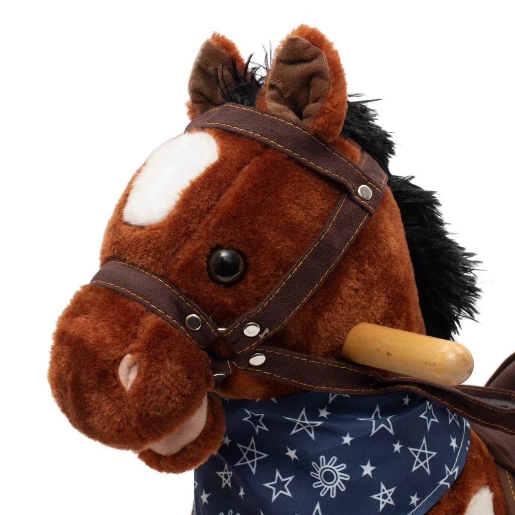 Bij het indrukken van de knoppen op de oortjes hinnikt het paard, laat het galopgeluiden horen, zingt het een cowboyliedje en beweegt het bekje en de staart. Tijdens het schommelen leren kinderen hun bewegingen beter coördineren en verbeteren ze hun algehele balans en fijne en grove motoriek. De houten latten en handgrepen kunnen eenvoudig worden losgeschroefd voor praktischer opbergen.