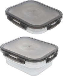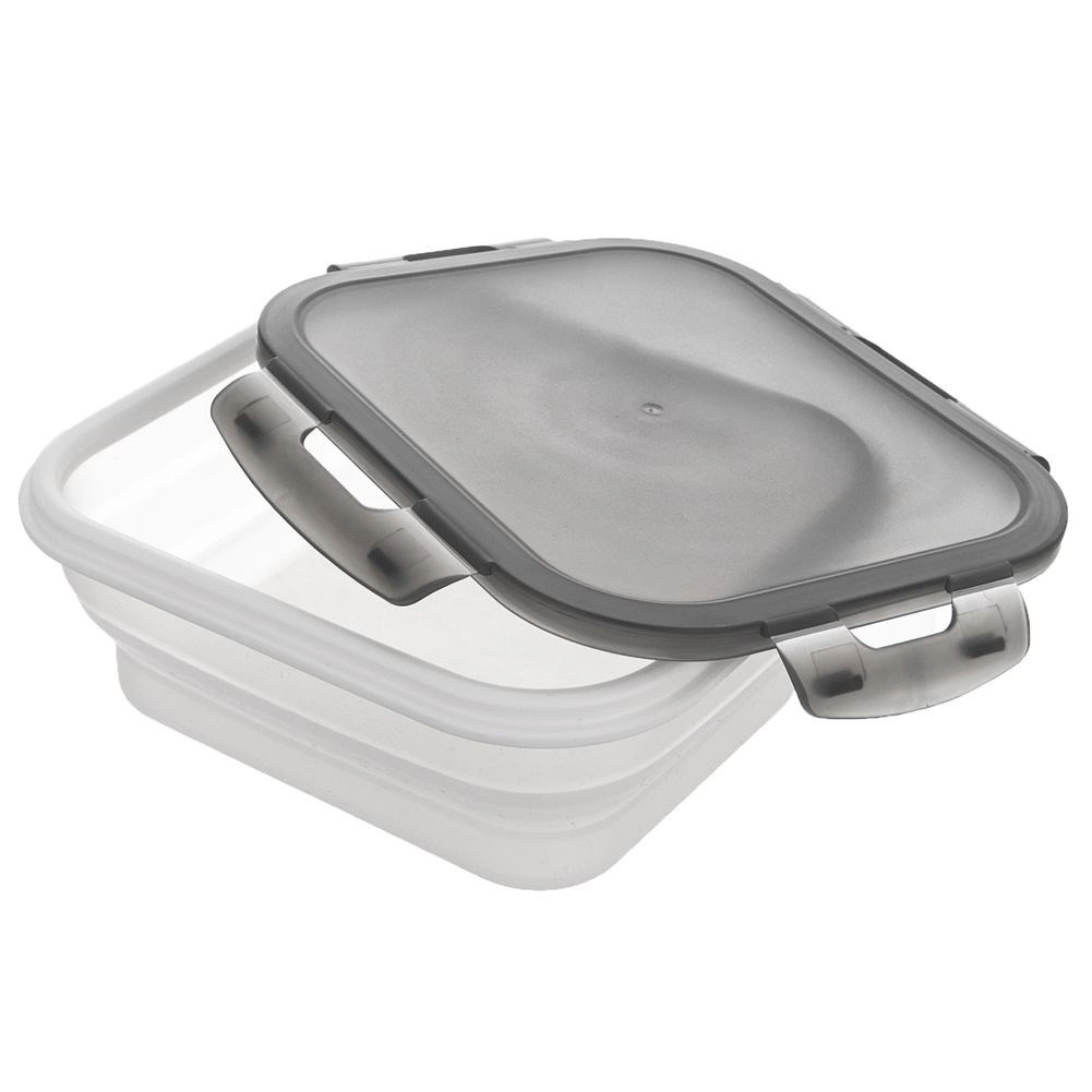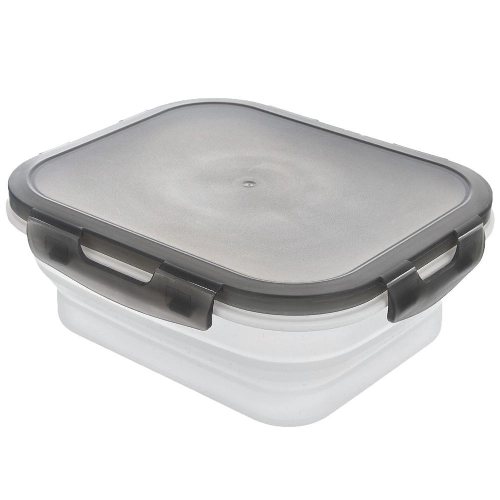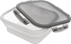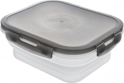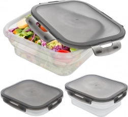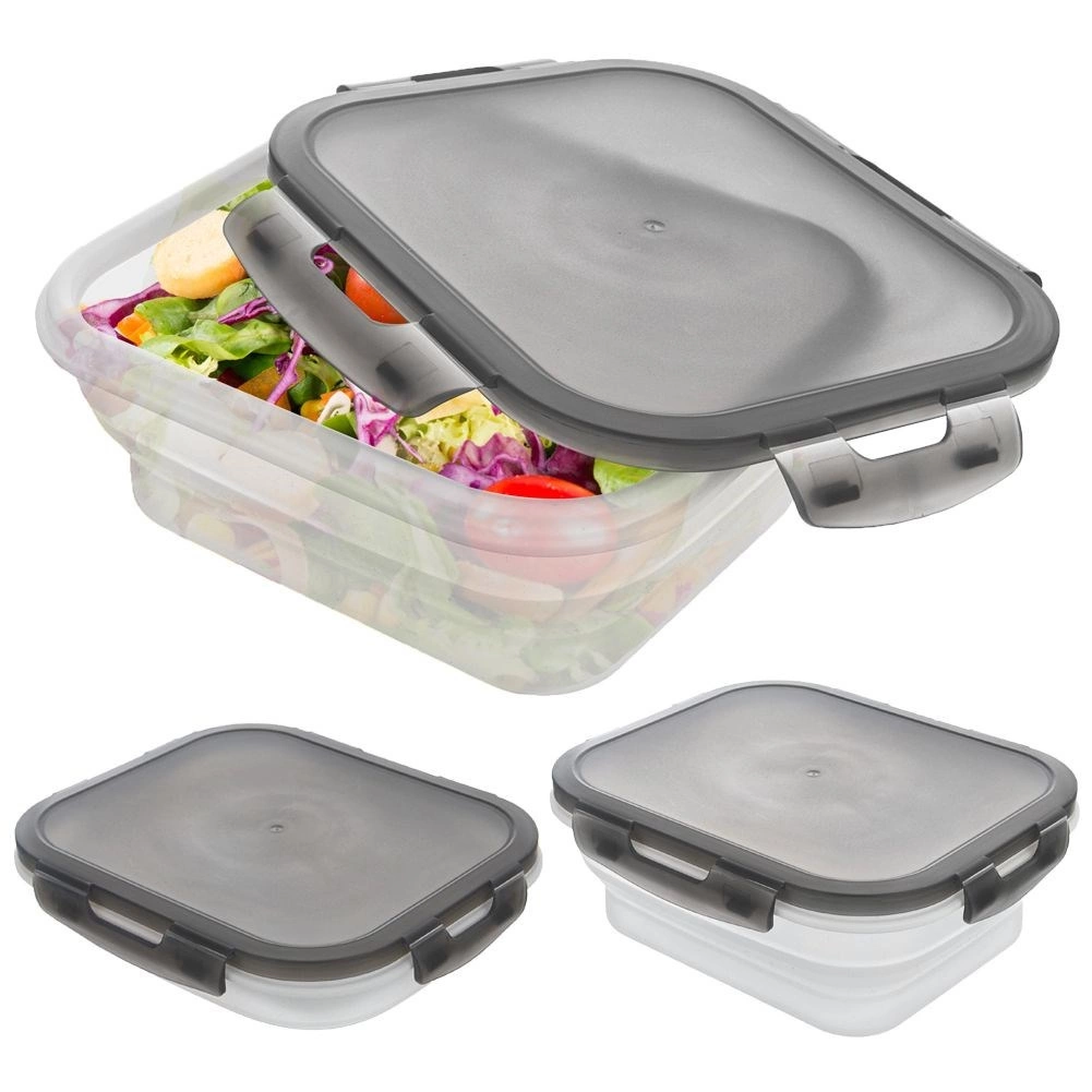 Praktische opvouwbare doos van 1 l met siliconen bodem en een luchtdicht deksel met vier klemmen houdt voedsel vers en veilig afgesloten. Dankzij het opvouwbare ontwerp bespaart hij ruimte, is hij ideaal voor reizen, kamperen en op het werk, en hij is vaatwasmachinebestendig en geschikt voor in de magnetron (zonder deksel).