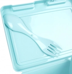Reisbestek van 14,5 cm (lepel + vork) opgeborgen onder het deksel, zodat je het overal gemakkelijk mee naartoe neemt.