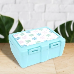 Stijlvolle lunchbox in een blauwe tint met bloemmotief op het deksel houdt je eten overzichtelijk gescheiden en veilig afgesloten. De interne scheidingswand creëert twee zones voor verschillende soorten gerechten, terwijl de praktische 2-in-1 spork (lepel + vork) zijn plek onder het deksel heeft, zodat je hem altijd bij de hand hebt.