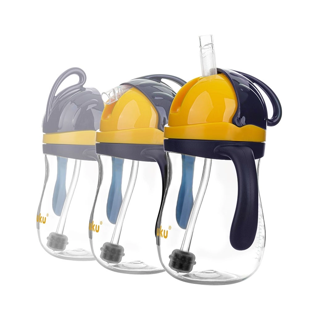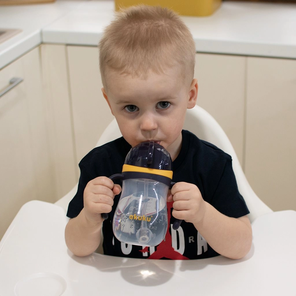 De Akuku kinderfles met siliconen rietje en gewicht is ontworpen voor zelfstandig drinken zonder morsen. Het gewicht aan het uiteinde van het rietje volgt het vloeistofniveau, zodat een kind comfortabel kan drinken zittend, in de kinderwagen of zelfs met de fles ondersteboven. De flipdop beschermt het rietje en voorkomt vervuiling.
