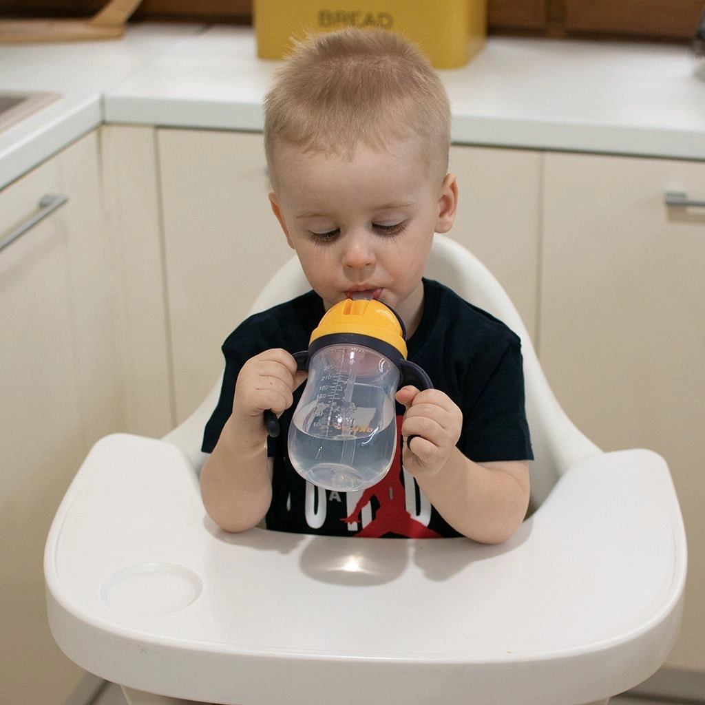 Het siliconen rietje met gewicht maakt het mogelijk dat een kind kan drinken zelfs wanneer het flesje gekanteld of omgedraaid is – het drankje wordt echt tot de laatste druppel opgedronken.