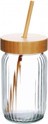 Geribbelde glazen drankfles met bamboe deksel en rietje 500 ml
