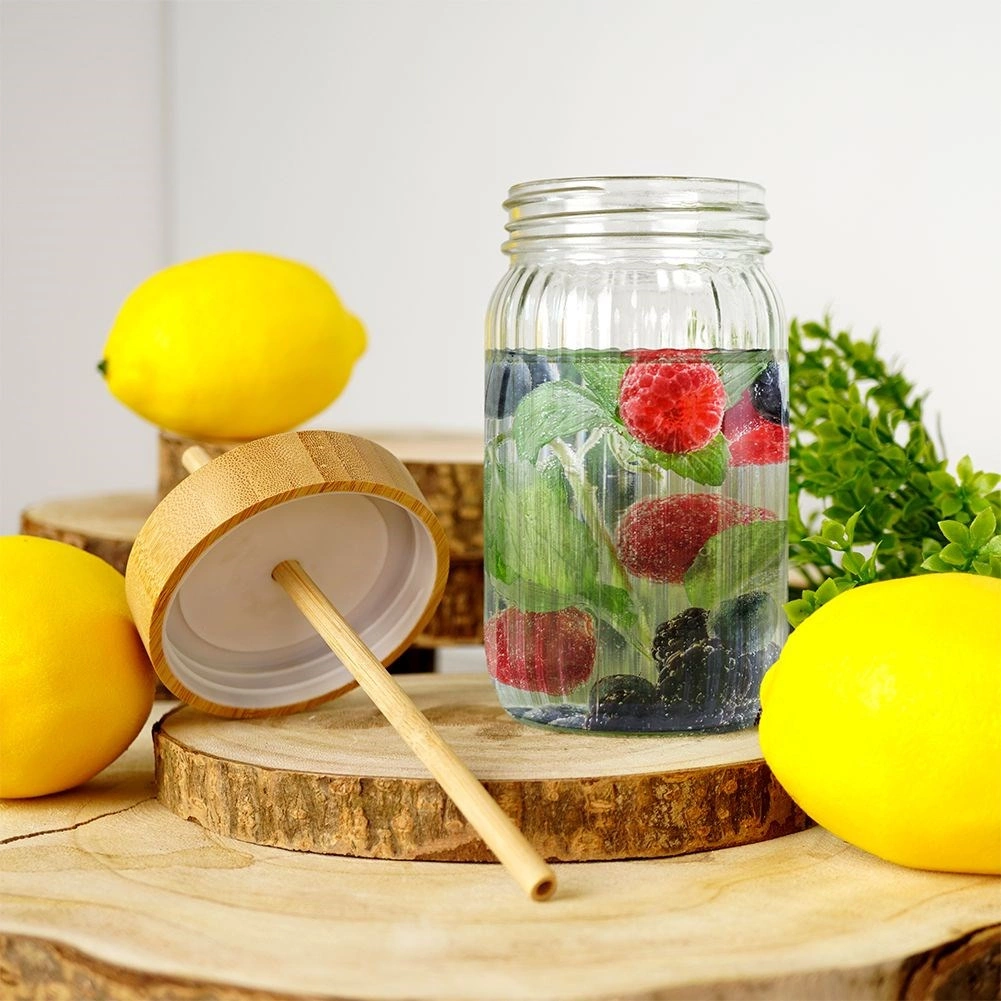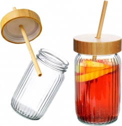 Stijlvolle glazen drankfles van 500 ml met bamboe deksel en herbruikbaar rietje, ideaal voor dagelijks drinken en zomerse feestjes. Dankzij het stevige geribbelde glas, het ecologische bamboe deksel en de veilige sluiting geniet je van water, limonade en cocktails zonder knoeien en zonder insecten in je drankje.