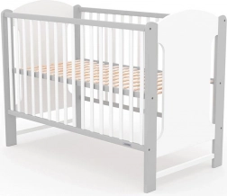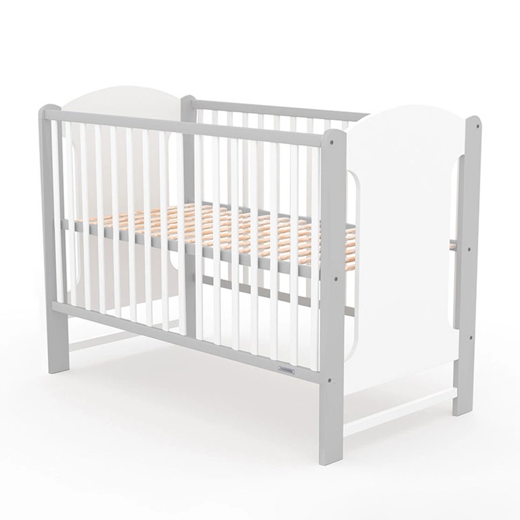 Stijlvol kinderledikant New Baby Elsa in wit-grijze uitvoering, combineert veiligheid, praktische functies en hoogwaardige afwerking van grenenhout. Biedt 3 hoogteposities van de lattenbodem, 3 uitneembare spijlen, EN 716-certificering en een geventileerde bodem voor een gezonde slaap.