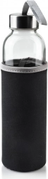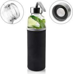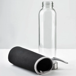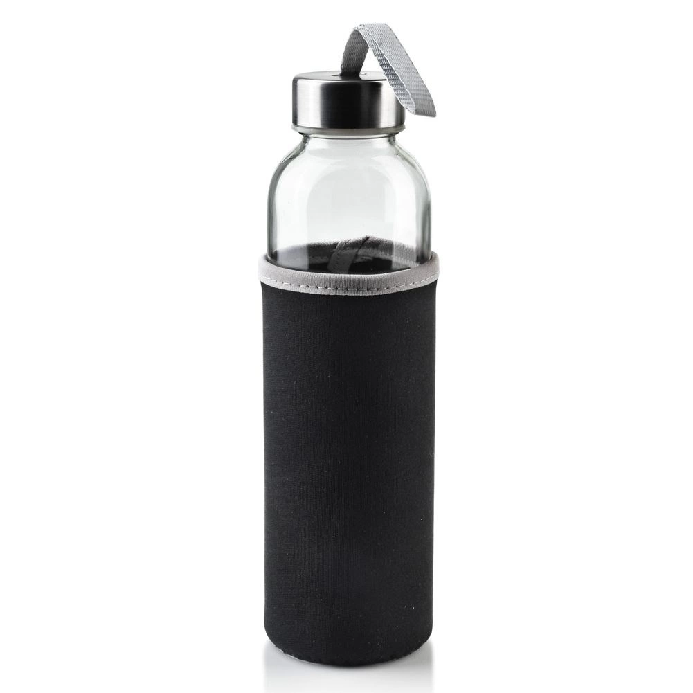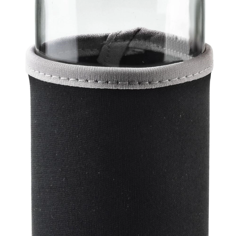 Elegante glazen fles met een inhoud van 490 ml, voorzien van een zwarte neopreen hoes en een roestvrijstalen dop, ideaal voor dagelijkse hydratatie. Dankzij de siliconen afdichting is hij volledig lekvrij, heeft hij een praktische draaglus en biedt de neopreenhoes betere isolatie en bescherming tegen beschadiging. Perfect voor warme en koude dranken thuis, op het werk, tijdens het sporten en onderweg.
