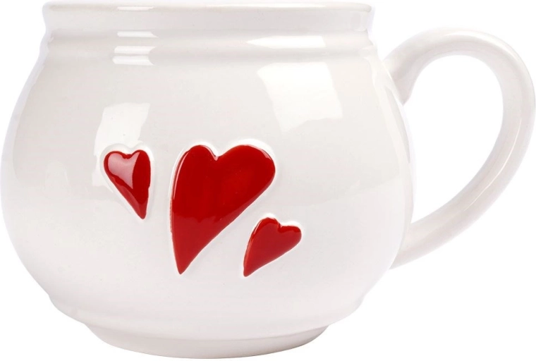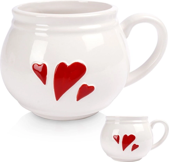 Stijlvolle witte keramische mok met reliëf rode hartjes en een ergonomisch oor, ideaal voor dagelijks drinken van koffie, thee en cacao. Biedt een inhoud van 430 ml, duurzame afwerking, geschikt voor vaatwasser en magnetron. Ook perfect voor glühwein en dankzij het romantische design een prachtig cadeau.
