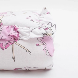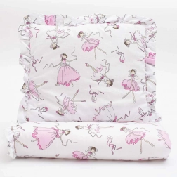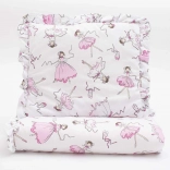 Zachte en comfortabele kinderwagenset met kussentje en dekentje met volant en een schattige ballerina-print. Gemaakt van hoogwaardige 100% katoen met een anti-allergische vulling voor veiligheid en comfort van je baby. Ademend, zacht voor de huid en met een rustgevend design voor elke kinderwagen.