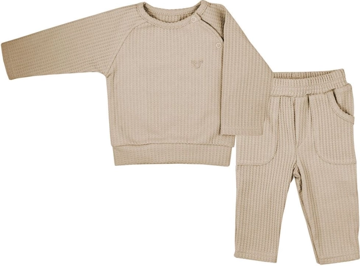 Stijlvolle 2-delige babyset KOALA Bello in beige die comfort met praktische details combineert. Bevat een shirt met lange mouwen met drukknoopsluiting onder de schouder en joggingbroek met bredere zoom en elastiek in de taille. De outfit is gemaakt van een prettig materiaal met een interessante structuur en patroon voor dagelijks draagcomfort.