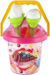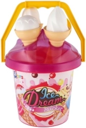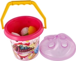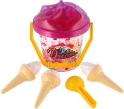 Deze kleurrijke zandset met stijlvol roze deksel en het “Ice Dream Bucket”-motief stimuleert fantasie, fijne motoriek en sociale vaardigheden bij rollenspellen als café, restaurant of winkel. Het deksel heeft speciale openingen om bolletjes te vormen, waardoor “ijs” van zand er net echt uitziet.