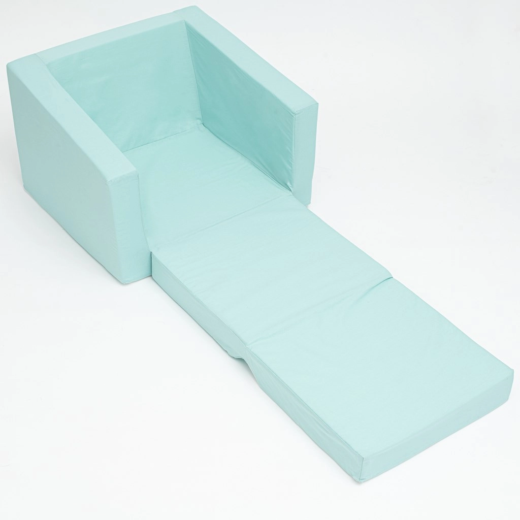 Comfortabele en lichte opvouwbare kinderfauteuil New Baby Elephant in mintgroen, ideaal voor elke kinderkamer. Gemaakt van zacht polyurethaanschuim, met een afneembare katoenen hoes met rits en dankzij het eenvoudige uitklappen biedt het multifunctioneel gebruik voor spelen, ontspannen en het kijken van verhaaltjes. Materialen voldoen aan OEKO-TEX STANDARD 100.